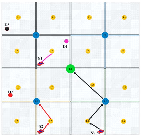 To avoid overloading the upper levels servers, each path request is treated based on its scope, more specifically it is treated at the lowest level that covers its source and destination positions, thus short paths that are within the scope of level 1 server are treated locally. Firstly, the vehicle initiates a path request, by sending a path request packet (PReq) with its current position and the final destination position. The PReq will be sent to the lowest level VVS through V2V communication, in case of isolated node where there are no neighbors in its coverage area, store–carry–forward approach is applied to deliver the path request to the VVS, the latter will decide either to treat the PReq locally or not if the destination position is situated inside its coverage zone (e.g., S1 in Figure 3). Otherwise, the PReq packet is forwarded to the upper-level VVS (e.g., S2 Figure 3). Similarly, long path requests are treated in the highest level VVS (e.g., S3 Figure 3). Upon the reception of the PReq packet, the VVS computes the shortest path from all possible paths which weighs greater than zero at the expected arriving time (fully reserved roads will be excluded from shortest path computing). Taking into consideration the previously answered path requests, and the routes’ weights from the RRM.