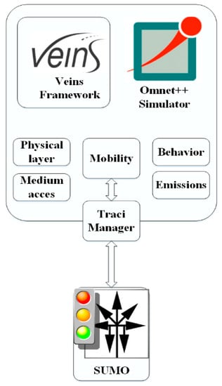 The simulation is conducted using Omnet++ network simulator [] along with the Vehicle simulation framework Veins [], and the SUMO traffic simulator. During the simulation, three programs are running in parallel: OMNeT++ manages the network simulation, SUMO runs the road traffic simulation and sumo-launched acts as a proxy between the two. SUMO dynamically changes the values through the Traci interface. Veins’s TraciManager class is responsible for connecting Sumo and Omnet++ as shown in Figure 4.