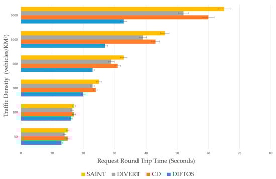 The performance of the four systems in terms of RRTT in different traffic densities is presented in Figure 5. We can observe that DIFTOS has the shortest RRTT, especially when the traffic density increases, that is due to the centralized nature of SAINT and CD (partially centralized in case of DIVERT). In CD and SAINT, the average RRTT time increases exponentially with the increase of TD, which is because the centralized server gets busy when more RReq arrive simultaneously. Which is not the case with DIFTOS, because some of the RReq are treated by lower level servers and do not need to be forwarded to the high-level server. Thus, DIFTOS sustains its stability in terms of RRTT, even when the TD is very high (see Figure 5). DIVERT also maintains a relatively short RRTT compared to SAINT and CD, but longer RRTT compared to DIFTOS. That is because the vehicular servers are not organized as a hierarchy like DIFTOS, therefore local RReq need to travel long distances.