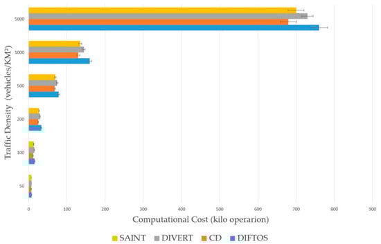 Figure 6 presents the performance of the four systems in terms of CC in different traffic densities. CD has the least CC among the four systems, that is because CD does not maintain the reservation matrix as the other three systems, it only calculates the optimal path for each vehicle regardless of the traffic conditions. SAINT and DIVERT have similar CC in different densities, and their CC is higher than CD’s; this is because they maintain a road reservation matrix, which needs regular updates that require more computation. From this shallow point of view, one could argue that CD, SAINT and DIVERT perform better than DIFTOS in terms of CC, but the calculation in these systems is done in the centralized server (partial at vehicles in DIVERT), while in DIFTOS the computation is distributed among the VVS; thus, the values of CC shown in Figure 6 are the sum of all VVS in case of DIFTOS.