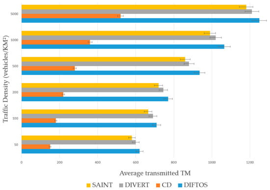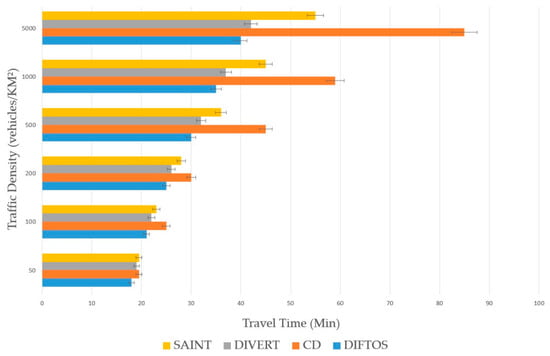 The effectiveness of DIFTOS in terms of travel time is obvious in Figure 7, where DIFTOS achieves the shortest average travel time. DIFTOS could maintain a reasonable TT, even under high traffic density. That is due to the re-routing strategy that allows it to determine the expected congested roads, and re-route vehicles away from these roads before they arrive. DIVERT also achieved a relatively short average TT for the same reason mentioned above. SAINT’s average TT is considerably longer than DIFTOS and DIVERT’s. However, CD had the longest average TT; this is because it does not consider the road reservations when computing the optimal paths.