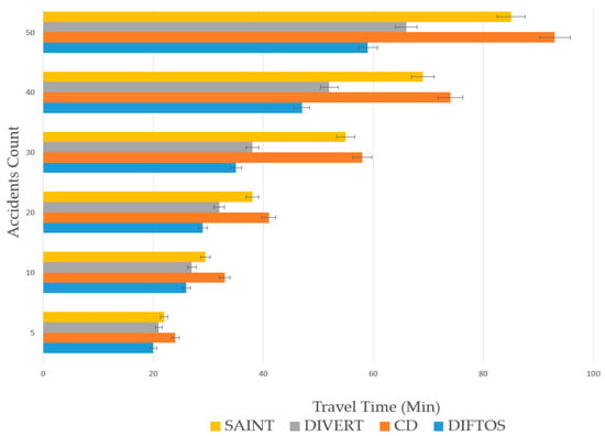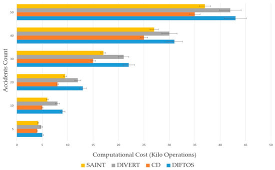 The effect of accidents on the computational cost and average travel time is presented in Figure 9 and Figure 10. The number of accidents is increased each time to evaluate the robustness of the four systems against traffic accidents, and their ability to mitigate the effects of such accidents. CD had the best resistance against accidents in term of CC. The reason for this is that in case of congestion due to an accident, the vehicles follow the same congested paths, and do not request the server for a new path, thus no additional computation is required. However, the CD’s average TT is the longest among the four systems, due to the aforementioned reason. SAINT and DIVERT have shorter TT compare to CD, as they update the vehicles’ paths in case of an accident. DIFTOS achieves the shortest TT among all systems. This is because the path update in case of an accident can be resolved at the local server level and it does not need to travel to a centralized traffic center, like in SAINT and DIVERT.