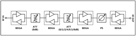 Figure 1 illustrates the configuration of the proposed TRM. The structure consists of a 6-bit phase shifter block, a 6-bit digital attenuator, and BDGAs for loss compensation. The phase shifter block is placed between two BDGAs to achieve better input and output return losses, thus resulting in a reduction in phase and amplitude variations in all of the phase shift states. The attenuator block is made up of attenuation units interspersed with BDGA blocks to diminish the loading effect which may cause unusual attenuation steps. There are four BDGAs employed in the proposed structure to compensate for the insertion loss of the attenuator and phase shifter blocks and also to provide a specific gain for the entire system.