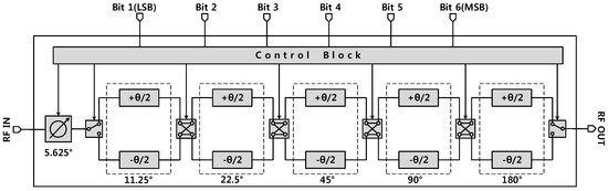 Figure 2 shows the block diagram of the designed phase shifter used in this work. The phase shifter consists of two SPDT switches, four DPDT switches, phase shifting elements, and a digital controller. Six bits of the digital control signals are input to the digital decoder through the SPI scan chain, which controls the corresponding switches of the phase shifter. The proposed phase shifter covers a range of 360° with a least significant bit (LSB) of 5.625°. Design optimization was performed on the HP/LP filter networks, and the SPDT and DPDT switch separately.