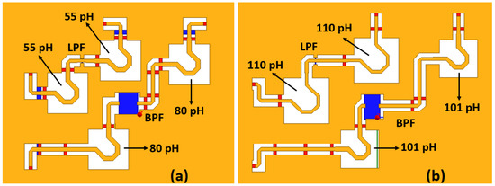 To supply the bias current to the reverse and forward amplifiers, two VDD are connected at the ends of the amplifier through choke inductors (LC). The capacitor at the gate of the input transistor isolates its gate bias voltage from the VDD. All bias voltages are provided through 30 kΩ resistors, as shown in Figure 13. All of the parasitics and coupling of the passive elements were considered by performing a 3-D EM simulation with HFSS.