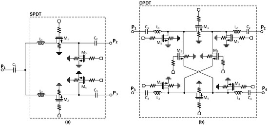 Circuit schematics of the SPDT (a) and DPDT (b) switches.