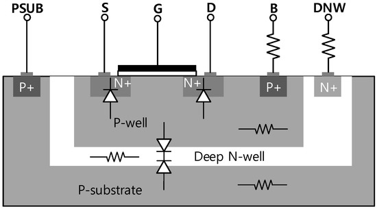 In the design of the SPDT and DPDT switches, the gate control terminals are biased through a large resistor RG to reduce fluctuations in the VGD and VGS of the transistors due to voltage swings at the drain and source terminals. This configuration maintains the ON resistance of the transistor unchanged and avoids an excessive voltage across the gate dielectric which might otherwise lead to a breakdown issue. Due to the conductive silicon substrate, MOSFETs used as switches in SPDT and DPDT induce a relatively high insertion loss. To alleviate the adverse effect of the lossy substrate, we applied a double-well body-floating technique which also enhances the power handling capability of the circuit. In the triple-well CMOS process, the local P-well and global P-substrate are separated by a deep N-well layer which introduces two new diodes, the diode between the P-well and the deep N-well, and the diode between the deep N-well and the P-substrate. A strong input signal can make source-body and drain-body diodes turn-on unintentionally, which might cause linearity degradation, and so the body of a MOSFET device should be kept as a high impedance node to prevent this phenomenon. Afterward, the body voltage is bootstrapped to the voltage swing of the input signal. This body-floating technique can be readily realizable by biasing the body of the P-well through a large resistor. However, maintaining the P-well at a high-impedance may result in another accidental turn-on with the diode between the P-well and the deep N-well layer. Thus, the deep N-well should also be biased through a large resistor so that it effectively floats in the RF frequency. Figure 5 shows a simplified cross-sectional view of an NMOS in a triple-well with resistors to achieve high-impedance nodes.