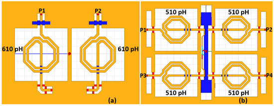 The inductors and capacitors in the phase shifting cells are fine-tuned to achieve precise phase shift levels. To reduce the chip area occupation, spiral inductors with a top metal layer of aluminum are implemented while metal insulator metal (MIM) capacitors available in the process design kit (PDK) are utilized. All of the passive structures of the phase shift units are simulated with a full-wave electromagnetic (EM) simulator, HFSS, as shown in Figure 3 for 11.25 and 22.5 phase shift units.