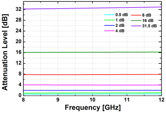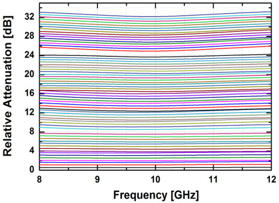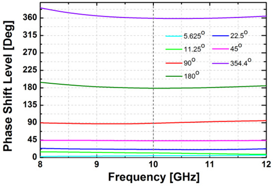 The simulated insertion loss of the attenuator block in the zero attenuation level is less than 10 dB at 10 GHz. As shown in Figure 11, the designed attenuator provides 31.5 dB of the maximum attenuation level with a step size of 0.5 dB in the simulation. In the frequency range of 9–11 GHz, the simulated RMS amplitude error is less than 0.5 dB while the simulated RMS phase error is less than 8.2°, as depicted in Figure 12.