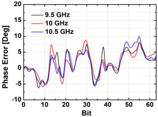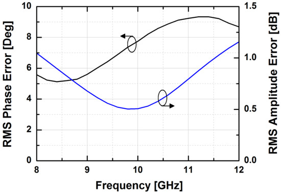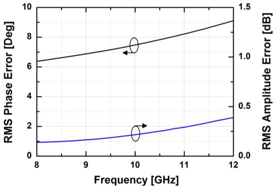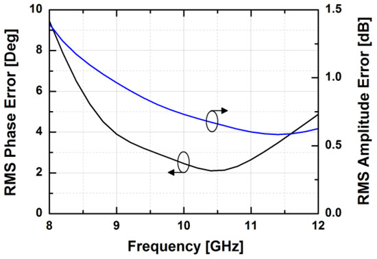 The simulated insertion loss of the designed phase shifter with zero phase shifting is less than 16 dB at 10 GHz. Figure 7 demonstrates the phase responses of the phase shifter in the main states. The proposed phase shifter provides a phase shift of 360° with an LSB of 5.625°. The simulated RMS phase error is less than 4° while the systematic RMS amplitude error is less than 1 dB at frequencies from 9 to 11 GHz, as presented in Figure 8. Owing to the HP/LP topology with on-chip passive elements, the proposed phase shifter does not consume DC power, except for the leakage current from the MOS switches.