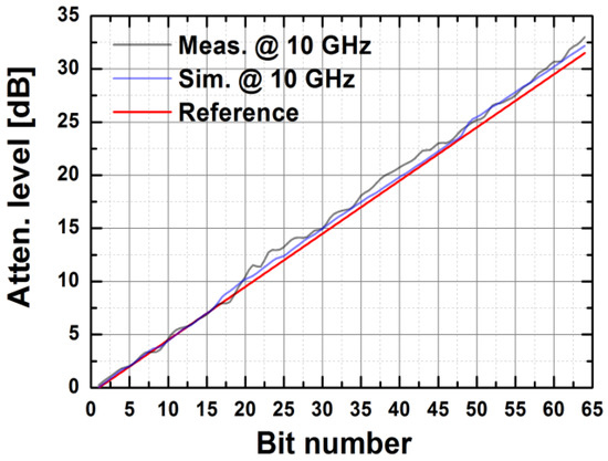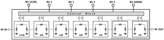 Figure 9 presents the proposed structure of the digitally controlled attenuator. A 6-bit CMOS digital attenuator was designed with a resistive Pi-type structure instead of a T-type in consideration of the range of resistance, and it is possible to fabricate it in practice. The proposed circuit covers the range of 0–31.5 dB of attenuation with a step of 0.5 dB. The whole of the 16 dB cell is separated into two 8-dB cells for optimal performance over the designated frequency range.