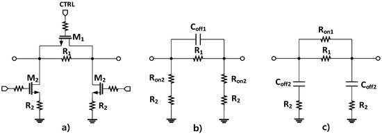 A schematic of the Pi-type resistive attenuator cell (a) and simplified models of it in the OFF (b) and ON (c) states.