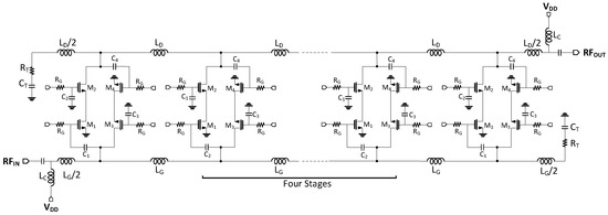 A circuit schematic of the proposed BDGA with six stages of gain cells.