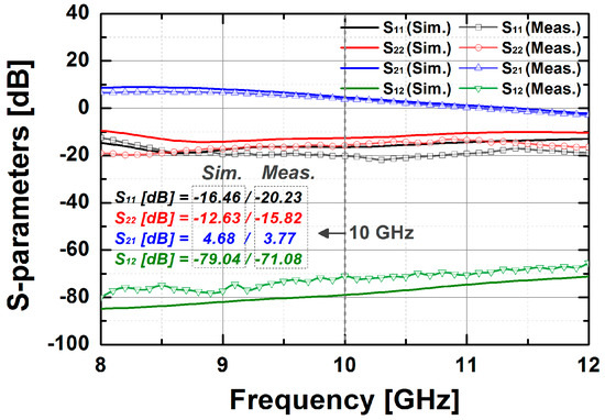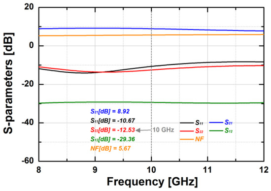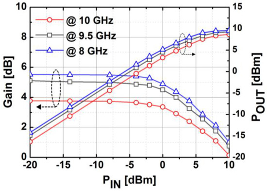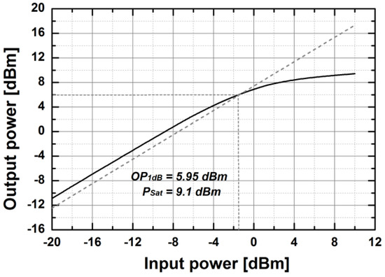 Figure 14 shows the simulated S-parameters of the BDGA block. The simulated gain of the BDGA is higher than 8.5 at 10 GHz, and the input/output return losses are better than 10 dB at frequencies from 9 to 11 GHz. The simulated noise figure (NF) is less than 6 dB at 50 °C. The total DC current consumption is 24 mA from a 1.2 V supply voltage. The reverse operation performances are almost the same as the forward one owing to the symmetrical layout. The simulated OP1dB is 5.95 dBm, and the saturated output power is 9.1 dBm at 10 GHz, as given in Figure 15. As shown in Figure 16, the simulated group delay of the BDGA is less than 110 ps from 9 to 11 GHz.