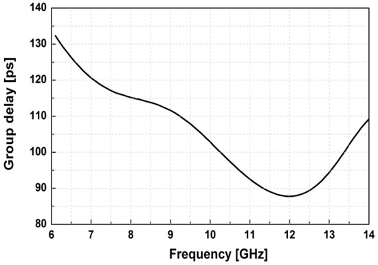 The group delay of the BDGA at frequencies from 6–14 GHz.