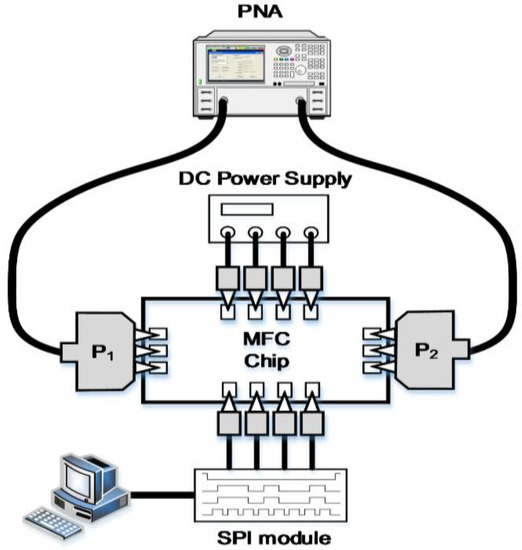 The block diagram of S-parameters, phase and attenuation response measurement setup as a function of the control bits.