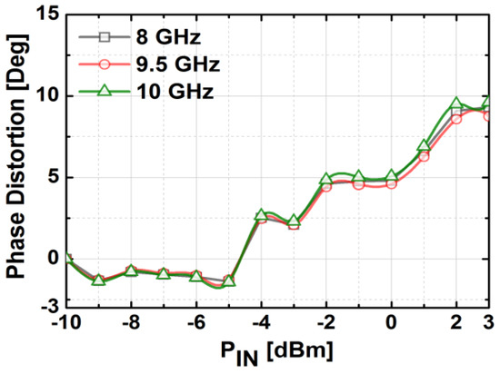 Figure 20 presents the measured S-parameters of the fabricated TRM at the reference state in which both phase shifter and attenuator blocks were set to zero. The transmission gain of the entire chain was around 3.8 dB at 10 GHz, which corresponds well with the simulation. The measured input and output return losses were better than 10 dB, and the isolation between Tx and Rx was higher than 60 dB over the whole X-band. As depicted in Figure 21, the measured NF is about 10 dB at 10 GHz. The measurement results of output power and gain of the TRM at different frequencies are shown in Figure 22. As can be seen, OP1dB was at 10 GHz which satisfied the initial specification of the target application. The total DC current consumption was 142 mA with a 1.2 V supply voltage, which was mainly by the BDGAs. We also measured AM/PM conversion with the Keysight N5224A network analyzer by sweeping the input power level as presented in Figure 23 at three different frequencies. The phase distortion (AM/PM conversion) increases sharply when the output signal is saturated with considerable input power.