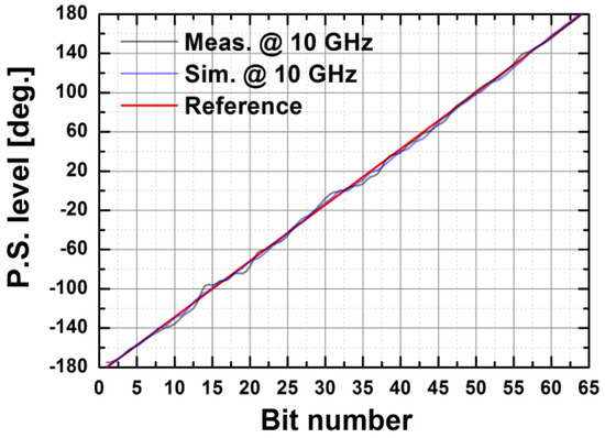 The measured phase shift levels vs. ideal values at 10 GHz as a function the control bits.