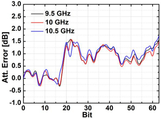Figure 24 depicts the measured relative phase response of the fabricated TRM in a total of 64 phase shift states. The system could generate a phase shift ranging from 0° to 360° with a step of 5.625° from 8 to 12 GHz. Figure 25 demonstrates the excellent correlation between the measured phase responses and the expected values at 10 GHz. Figure 26 shows the relative attenuation levels of the fabricated TRM in a total of 64 attenuation states after setting the phase shifter for zero phase shifting. The system could provide an attenuation level of up to 31.5 dB with a step of 0.5 dB over a range of frequencies from 8 to 12 GHz. Figure 27 presents a comparison between the measured amplitude responses and the theoretical values at 10 GHz. To qualitatively examine the phase shifting performances of the fabricated T/R chipset, the RMS phase and amplitude errors in all of the phase shift states are presented. The measured results show that the RMS phase errors were below 4° from 9 to 11 GHz while the RMS amplitude error was less than 0.9 dB from 9 to 11 GHz, as shown in Figure 28. The RMS amplitude errors in all of the attenuation states with the phase shifter block set to zero are shown in Figure 29. We could see the measured RMS amplitude error was around 0.5 dB at 10 GHz while the RMS phase error was below 8° at 9–11 GHz. The phase and attenuation errors between the measured and the expected (ideal) values over all the phase shifting states, and attenuation errors over all the attenuation states at three different frequencies are also presented in Figure 30 and Figure 31, respectively.