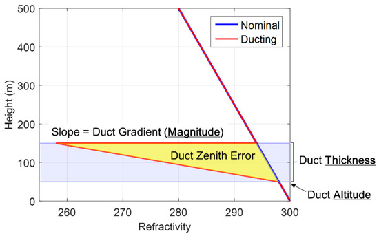 Figure 2 shows the three-parameter wedge model for the duct anomaly proposed by the Illinois Institute of Technology. The blue and red lines are the refractive index under normal conditions and the duct anomaly, respectively. The area between the blue and red lines is the estimated zenith error caused by the duct anomaly. The model assumes that once the duct ends, the refractivity index instantaneously recovers the nominal profile values, which may not be realistic. Therefore, we just use the duct gradient to determine whether the duct anomaly exists. The error caused by the duct anomaly is calculated using a numerical integration method.