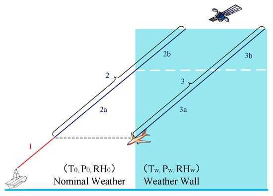 In 2008, Ohio University proposed a “Weather Wall model” for the non-nominal troposphere, as shown in Figure 3 [4]. In this model, the troposphere is partitioned by an infinite vertical plane, either side of which is defined as nominal ‘0’ and worst-case ‘w’ weather conditions for the temperature (T), pressure (P), and relative humidity (RH). In Figure 3, paths 2 and 3 are split into 2a, 2b and 3a, 3b, respectively. The split is made as the ship station signal leaves the worst-case weather wall. Path 3 is thus contained entirely within the weather wall with conditions (Tw, Pw, RHw), while path 2 to the ship experiences nominal conditions (T0, P0, RH0) during part 2a and during part 2b (Tw, Pw, RHw). The troposphere delay difference experienced by paths 2a and 3a is the non-nominal troposphere error. Without loss of generality, the weather wall can be on the right side of the aircraft or on the left side [6].