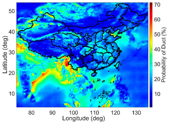 In this paper, the duct gradient is used to determine whether a duct occurs. That is, if the absolute value of the gradient of the refractivity index changes with altitude exceeds 100/km, then the duct anomaly is considered [11]. Figure 4 shows the map of the duct likelihood of occurrence using 8 years of ECMWF data (2010–2017). In this map, only ducts occurring below 500 m are considered. The map illustrates that the likelihood of a duct appearing below 500 m in some regions can reach 70%, and in the Bohai Sea it can reach approximately 45%. Therefore, to ensure the integrity of the system, the impact of troposphere ducts must be considered.