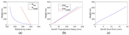 Figure 5 shows an example of a duct anomaly. Figure 5a compares Nreal (blue curve) and Nmodel (red curve) at a selected location (37.8° N, 120.6° E) in the presence of a duct at 12:00 on 1 June 2017. The refractivity gradient in the presence of a duct is much higher than the nominal case. Figure 5b shows ZTDreal and ZTDmodel, and Figure 5c shows the zenith duct error for this example. In Figure 5, the zenith duct error at 500 m is approximately 15 mm, which results in a slant error of approximately 11.49 cm for a satellite with an elevation of 7.5°. The duct error is much larger than the magnitude of the carrier-phase measurement noise. Therefore, the duct error is an important error source for Sea-Based JPALS.