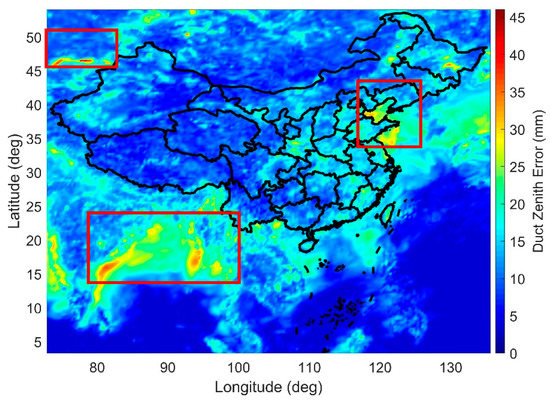 Figure 6 shows the map of the worst-case zenith duct error observed at each grid point in China and the surrounding areas during the period from 2010 to 2017. The large duct errors are mostly found at the junctions of land and water, such as the Balkhash Lake in Southeast Kazakhstan (upper left in Figure 6), the Bay of Bengal, the Andaman Bay (lower left in Figure 6), the Yellow Sea and the Bohai Sea (top right in Figure 6).