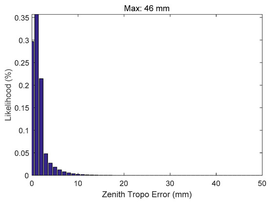 To provide a better stochastic representation of the data, a histogram of the zenith duct error is shown in Figure 7. This histogram shows that the maximum error range that was observed at 500 m is 46 mm at the zenith (approximately 35.24 cm for a 7.5° elevation satellite).