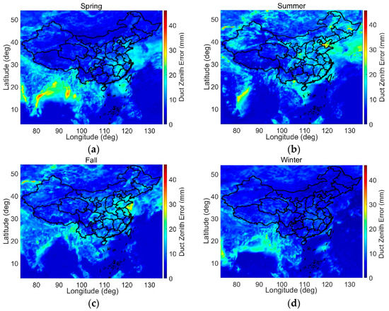 Figure 8 shows maps of the maximum zenith duct errors at 500 m for the four seasons. Different seasonal features appear for the duct anomaly in different places. In the Bay of Bengal and Andaman Bay, there are larger duct errors in the spring and winter than in the summer and fall. In Balkhash Lake, large duct errors occur in the summer and fall. In the Bohai Sea and Yellow Sea, large duct errors occur in the summer and fall, respectively. For the illustrated area, the maximum zenith duct errors in the four seasons of spring, summer, fall, and winter are 38.46 mm, 45.64 mm, 39.98 mm, and 32.98 mm, respectively.