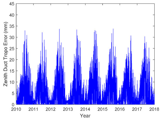 The simulation below is conducted at a location (120.3° E, 39.9° N) in the Bohai Sea. Figure 9 shows the zenith tropospheric duct errors at the simulated location from 2010 to 2017. The seasonal variation pattern of the duct errors is prominent and similar every year, and the errors in the summer are generally larger than those in the other three seasons.