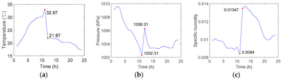 The maximum hourly changes of temperature, pressure, and specific humidity in the Bohai Sea and Yellow Sea from 2010 to 2017 are calculated based on ECMWF data to be 12.77 °C/h, 13.21 hPa/h and 0.0078/h, respectively. Since the input parameter of the modified Hopfield model is the relative humidity, the specific humidity change is converted to a relative humidity change, being approximately 48% [2,15].
