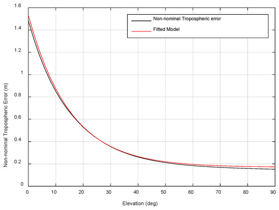 The black line in Figure 12 represents the non-nominal tropospheric errors at different elevation ranges, while the red line represents the fitted model as the following equation.
