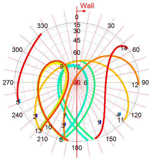 The satellites whose signals pass through the Weather Wall will be affected by the non-nominal troposphere. To select the affected satellite subset Q, the azimuth of the wall needs to be determined. As the Weather Wall exists at one side of the aircraft and the specific azimuth of the wall is not certain, we search for the azimuth of the wall in steps of 10°, as shown in Figure 13, considering the worst satellite geometry possible. The azimuth is selected where the value of is maximal in each epoch [10]. Svert is the vertical component of the geometry matrix for the visible satellite [24]. μ is the bound value of the non-nominal tropospheric error calculated using the fitted model.