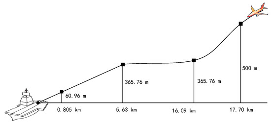 In this work, a straight-in approach (Case-III landing approach) is assumed [26,27]. The simulation area begins with the aircraft being 500 m above the ship and the horizontal distance being approximately 17.70 km, as shown in Figure 14.