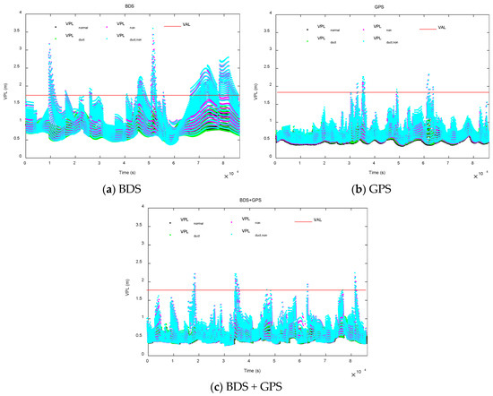 Vertical Protection Level (VPL) simulation results under BDS/Global Positioning System (GPS)/BDS + GPS constellations.
