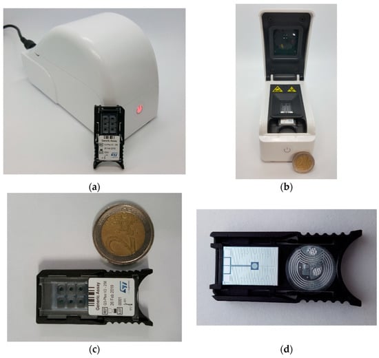 (a) The Q3-Plus V2 instrument closed, with the disposable unit (LoC cartridge) for comparison; (b) View of the open instrument. The optical system is inside the upper lid. In the lower part, the housing for the cartridge is visible, under which the control electronics and the cooling fan are positioned; (c) Front view of the cartridge, in which the six wells are visible; (d) Back view of the cartridge, evidencing the heater and temperature sensor on the flipside of the silicon die, as well as an RFID tag.