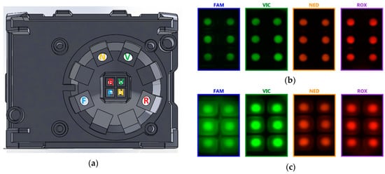 (a) Layout of the optical module, integrated in the upper lid of the instrument, evidencing the filtered LED sources (around) and the corresponding filtered CMOS sensors (in the center); (b) Fluorescent pictures from the four detection channels, with melted wax. The software determines the precise position of the circular regions of interest—i.e., the drops of reaction mixture plus sample—for accurate integration of the fluorescence signal; (c) Fluorescent pictures at low temperature: light scattering from solid-state wax outlines the area of the wells, compared with the reagents’ drops inside.