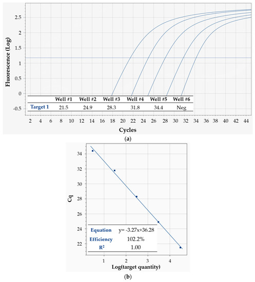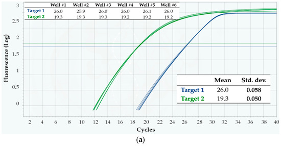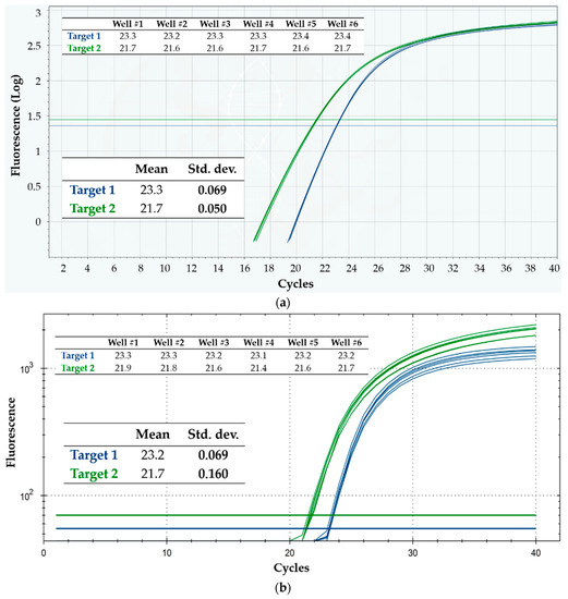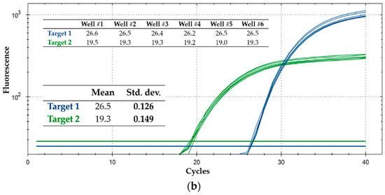 Typical qPCR curves obtained on a cartridge are shown in Figure 7a. The corresponding linearity results are summarized in Figure 7b: shown are two classic standard curves for absolute quantification, one for each target, obtained from the same cartridge. The data are in excellent agreement with the predictions, with the linear model scoring R2 = 1 for both targets, which amounts to perfect linearity of Cq values and correspondingly reliable absolute quantification of target sequences within the allowed precision. Moreover, the mean reaction efficiency (calculated from the slope of the linear fit, according to a standard formula) was 98.1% for target 1, and 93.6% for target 2—definitely lying inside the very good efficiency range (90–110%, when efficiency is calculated with this method [18]).