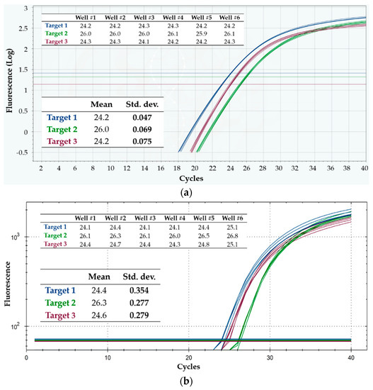 Figure 6a,b show the RT-qPCR curves, as well as the average and standard deviations of Cq values from a Q3 cartridge and a CFX96 run, respectively, while Table 3 contains a summary from both platforms. Once more, the intra-cartridge repeatability was found higher in Q3, for both targets—and higher than in CFX96 (by about a 2.5 factor). The same held for the inter-run reproducibility, with standard deviations about 2.8-fold larger in CFX96 than in Q3. Thus, precise quantification of target RNA sequences is also possible with the Q3 system, even when multiplexing.