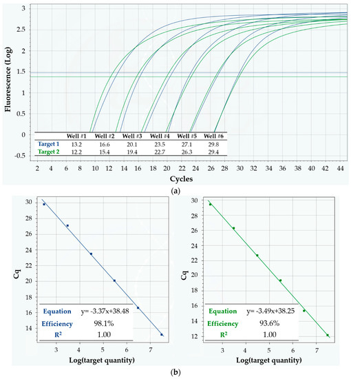 Linearity of Q3-Plus V2 in multiplex detection of two DNA targets in a 10-fold dilution series, using Protocol 4. (a) Fluorescence vs. cycle qPCR curves. Blue curves refer to target 1, while green ones refer to target 2. The inset table displays the corresponding Cq values; (b) Standard curves for absolute quantification of target quantity. The inset tables show the equation of the linear fit, as well as its R2 value and the mean reaction efficiency for target 1 (left, in blue) and target 2 (right, in green).