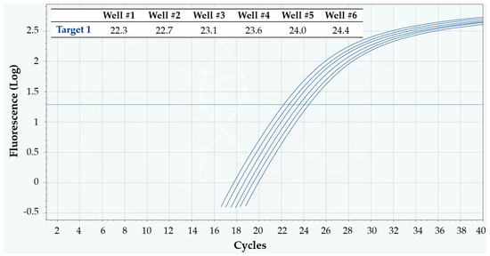 Figure 9a shows the qPCR curves from one cartridge, while Figure 9b displays the corresponding standard curve, its equation, the calculated efficiency and R2. Again, the obtained Cq values perfectly agreed with the linear fit, as seen from R2 = 1. The calculated mean reaction efficiency was 102.2%—comfortably lying inside the range that is considered optimal when efficiency is calculated with this standard method, i.e., 90–110% [18]—indicating perfect efficiency. As to sensitivity, the most diluted sample contained only 3 target DNA copies/reaction nominally—and yet, it was clearly detectable. Very importantly, the NTCs of all cartridges resulted negative as expected—ruling out any possible contamination artefacts in the detection of low-concentration samples, and confirming the high sensitivity of Q3-Plus V2. This result is even more remarkable if one considers that it was obtained on human genomic DNA, purified from whole blood—meaning that extreme sensitivity can also be achieved on real specimens. It is also worth pointing out that sensitivity not only depends on the performance of the system, but also on the specific qPCR reaction assay used for the analysis.