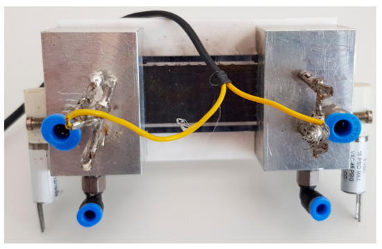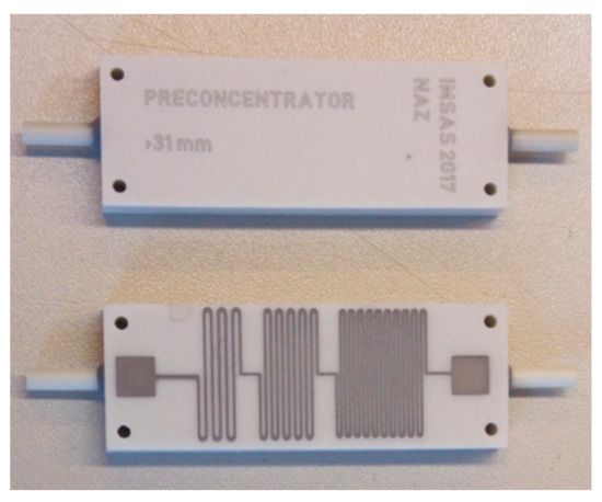 Figure 3. It consisted of two pieces, which formed a single unit by co-firing. The two hoses were glued to the two ends of the device. A metallic heater screen printed on the backside of the ceramic preconcentrator chip was divided into three sections with a total resistance of 132 Ω ± 4 Ω.