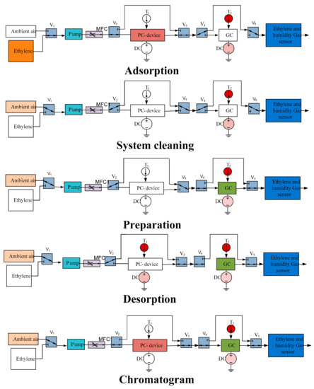 Figure 6. The system consisted of five valves (V1 to V5), a micro gas chromatographic column filled with Carbosieve SII as a stationary phase, a pump, a mass flow controller, an electrochemical ethylene gas sensor and a humidity sensor. The valves were used to switch between the gases. The gases used in the system were ethylene gas and ambient air. The pump was used to draw air or ethylene from the environment and send it to the chromatographic system. The flow rate of the gases was controlled at 10 sccm by the mass flow controller.
