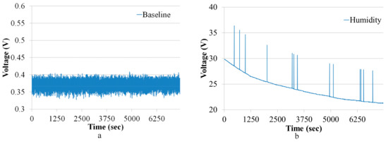 Figure 8a shows the baseline of the gas chromatographic system obtained using ambient air as carrier gas. The gas chromatographic column was connected, the preconcentrator was bypassed, and the baseline of 7400 s was obtained. The flow rate was fixed at 10 sccm. The data from the humidity sensor during the baseline measurement are shown in