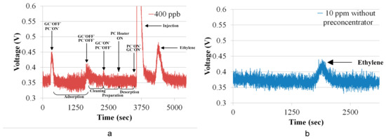 Figure 9a shows the chromatogram of ethylene at a concentration of 400 ppb. Adsorption of ethylene gas was carried out for 1200 s, and the times for system cleaning, preparation and desorption were all 600 s. The initial peaks were attributable to the switching between the preconcentrator and the gas chromatographic column, as the switching altered the flow rate in the gas chromatographic system. The injection peak was obtained after the desorption and the peak next to injection peak was the ethylene peak. The total time taken for a single measurement was 5000 s. To investigate the effectiveness of the preconcentrator, ethylene with a concentration of 10 ppm and a volume of 2.7 mL was injected into the gas chromatographic system without the preconcentrator. The chromatogram of ethylene with a concentration of 10 ppm is shown in