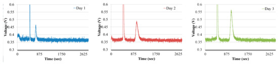 To evaluate the effectiveness of the gas chromatographic system in the presence of interfering gases, ethylene gas was extracted from ripening bananas. Bananas with a weight of 0.2 kg were stored in a sealed box with a volume of 50 L. Each day, ethylene gas was extracted from the box for a period of three days. The chromatograms obtained from the ripening bananas are shown in