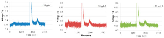 To further analyze the system repeatability and the resolution, the efficiency of the preconcentrator was increased by increasing the flow rate to 20 sccm during adsorption. Increasing the flow rate resulted in an increase in the adsorption of ethylene in the preconcentrator. The ethylene concentration of 50 ppb was prepared by mixing 400 ppb ethylene gas with synthetic air; see [