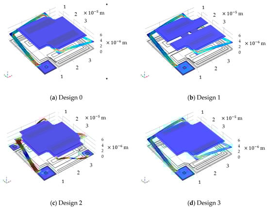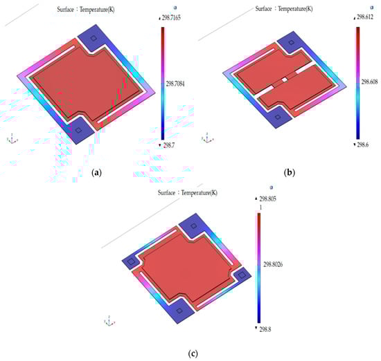 Based on the modeling processes and initial condition of experimental design in Section 3.2, the average temperatures of suspended film and the substrates of the microbolometer sunder the 3D thermal modeling are 298.717 (Design 0 and 3), 298.612 (Design 1) and 298.805 mK (Design 2). In Figure 6, the temperature differences are 16.5, 12 and 5 mK between the surface of the suspended microbolometers and the substrates, respectively. It is obvious that the above value of Design 2 is the smallest among the 4 microbolometer structures due to the largest thermal conductance shown in Table 3.