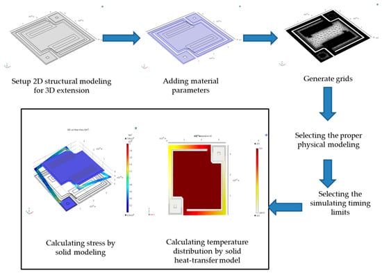 Firstly, using the finite-element analytic method by COMSOL [,,,], the 3D physical microbolometer structure is modeled. The following steps include 2D top-view drawing of each physical layer built in microbolometer device, the set-up of dimensional size and thickness of each layer, inputting the material parameters of each layer deposited for microbolometer device, structuring proper meshed grids on single device element, and combining the heat-transfer physical equation modeling to solve the convergent results of thermal distribution on the suspended microbolometer device. For decreasing the calculated loading of central processing unit (CPU) and getting simulating times, structure stress distribution of each layer is excluded. The modeling processes are followed as step by step, shown in Figure 3: